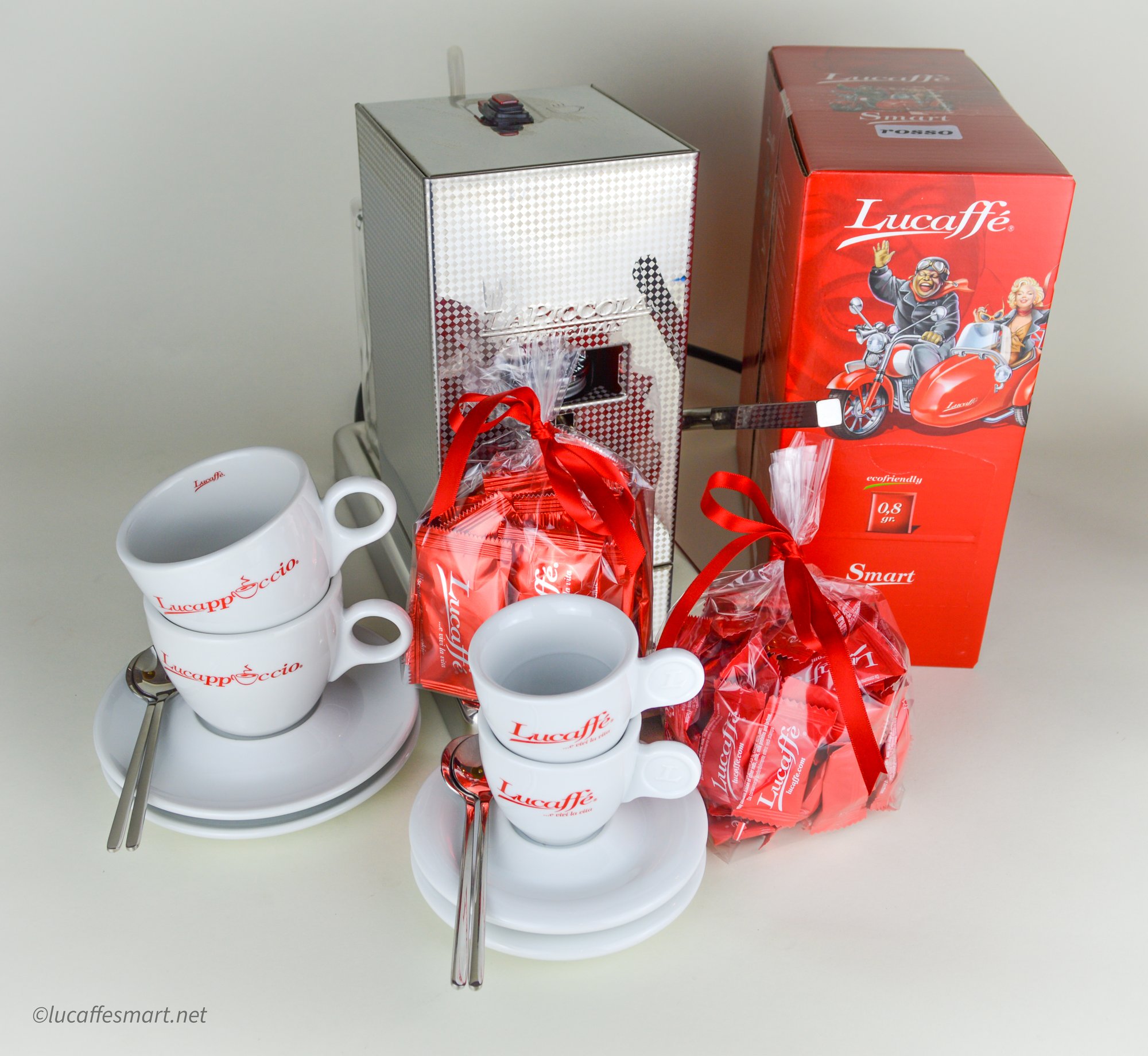 Package Includes: 1 Piccola Satin, 1 Box of Classic Rosso Smart PODS, 2 espresso cups/saucers, 2 cappuccino cups/saucers, 4 silver espresso spoons, Lucaffé biscotti and Lucaffé chocolate covered almonds.
